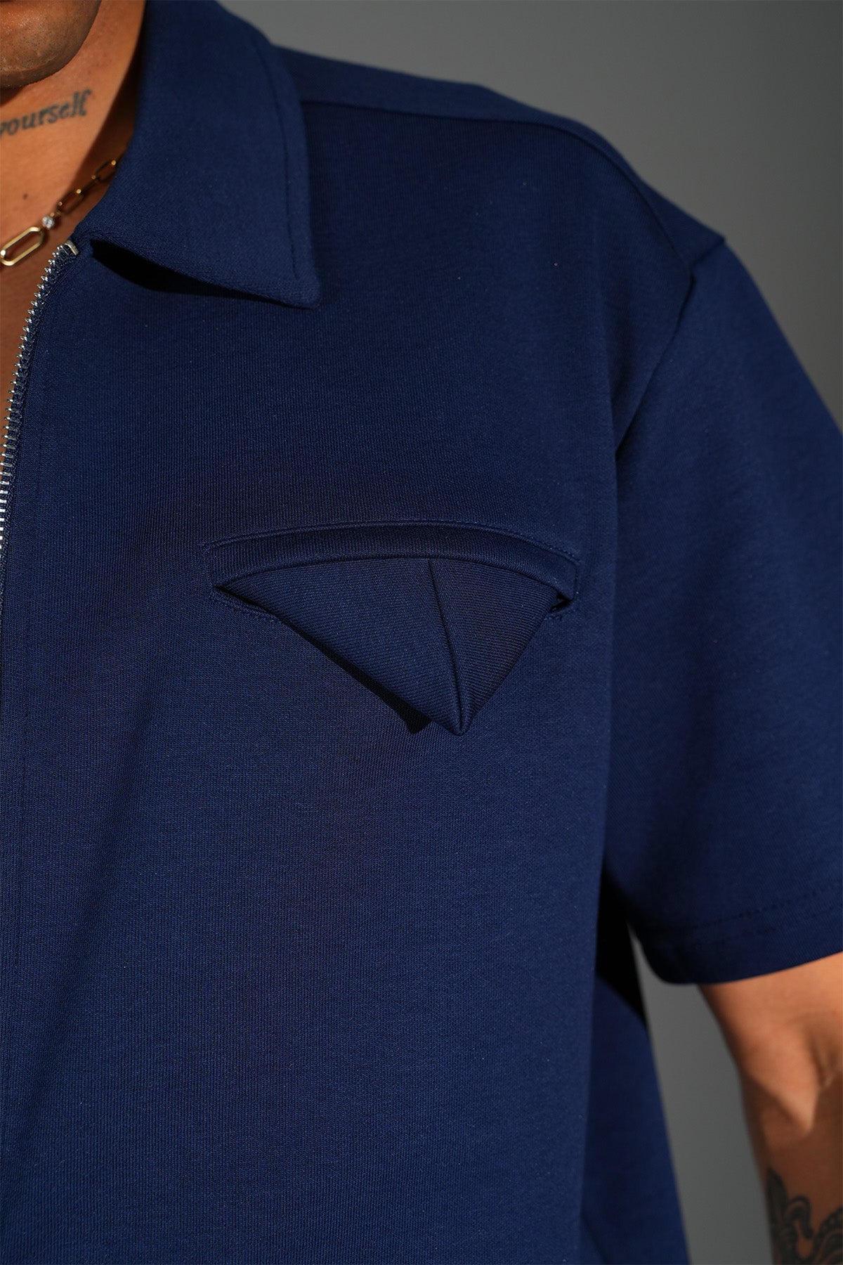 - Shirt-style lapel collar