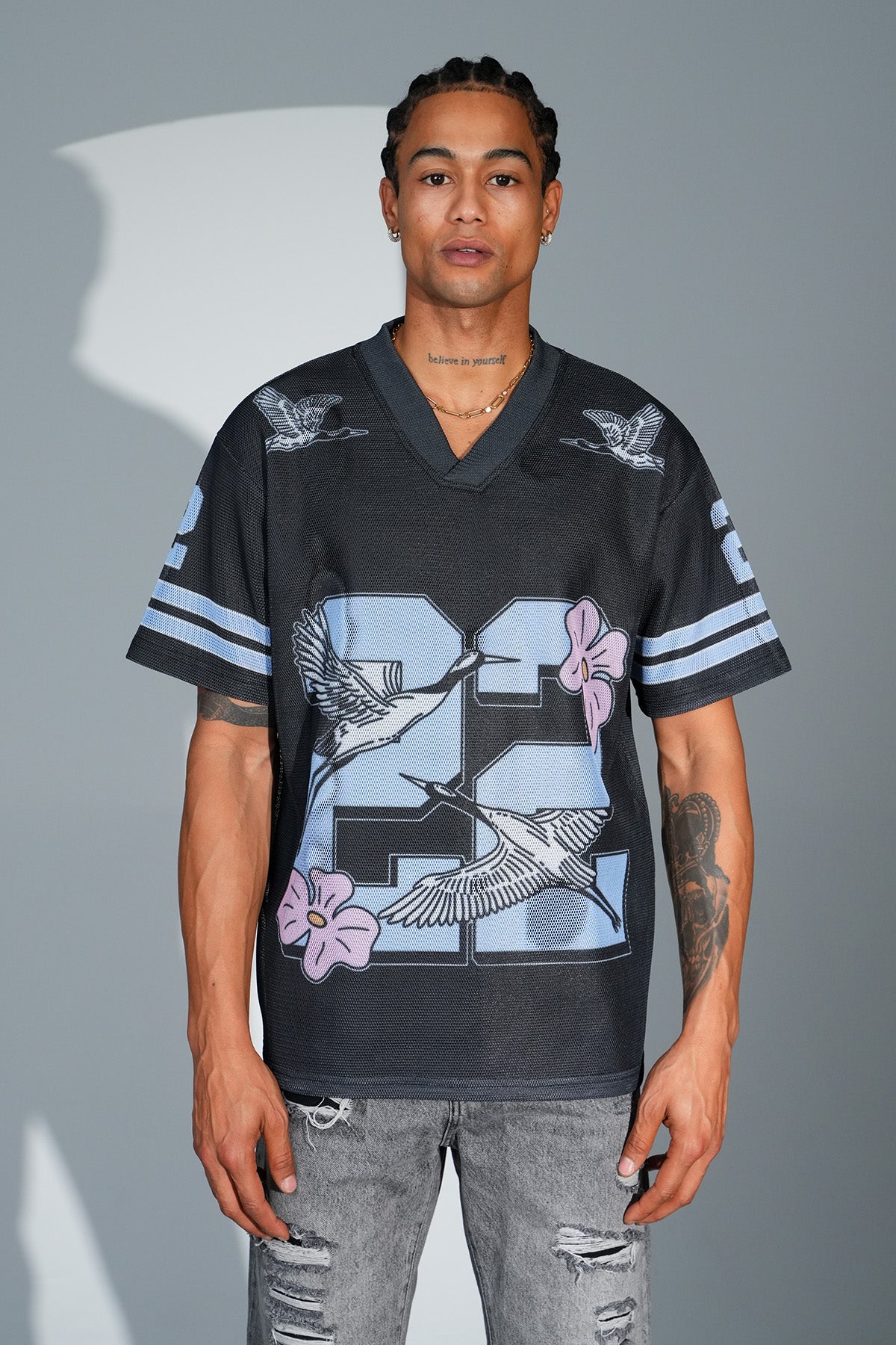 - Oversized jersey-style T-shirt